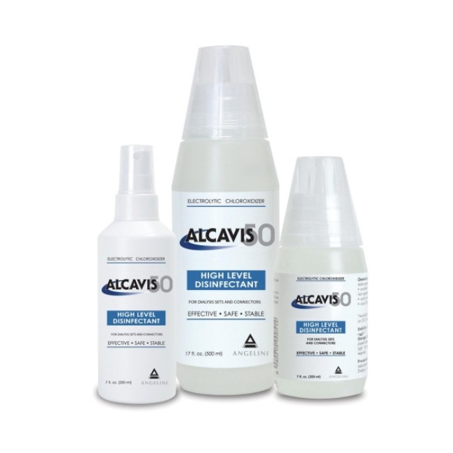 Alcavis 50 HIGH LEVEL DISINFECTANT - Stable for up to six months after opening. Effective! - high level disinfectant, fast-acting, active against bacteria, fungi, spores, mycobacteria, and viruses - Safe! - non-sensitizing, non-allergenic - Compatible! - can be used with all catheters and connectors currently on the market - Contact time of 2 minutes. Compatible with silicone and polyurethane catheters, connectors and caps currently available on the market. Clear non-staining solution for dialysis disinfection.