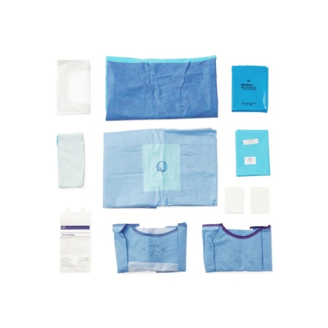• Pack includes: reinforced table cover, 50 x 90 (127 x 229 cm); Mayo stand cover, 24 x 53 (61 x 135 cm); Sirus nonreinforced gown (L) with towel in outer wrap; Sirus poly-reinforced raglan gown (XL); prep U-drape with adhesive, 47 x 51 (119 x 130 cm); suture bag (paper); impervious U-drape with adhesive, 54 x 76 (137 x 193 cm); impervious stockinette, 12 x 48 (30 x 122 cm); four drape tape strips; arthroscopy drape with fluid-collection pouch, 90 x 121 (229 x 307 cm) and hand towel