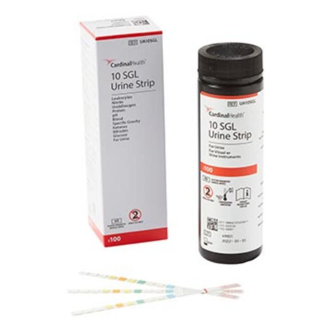 10SGL URINALYSIS TEST STRIP. 10 ANALYTES. LEUKOCYTES/NITRITE/UROBILINOGEN/PROTEIN/PH/BLOOD/SPECIFIC GRAVITY/KETONES/BILIRUBIN/GLUCOSE is manufactured by Cardinal Health™.