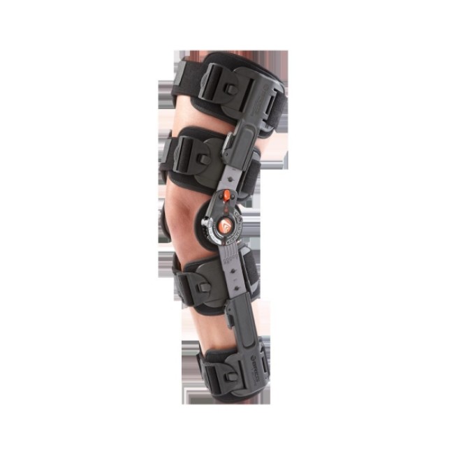 Easy to use ROM hinge with quick-adjusting flexion and extension stops to control and limit knee flexion and extension. Telescoping calf and thigh sleeves for sizing a wide range of patients from 5 to 64 tall. Easy to use extension drop lock allows the brace to be locked out in 5 positions (in -10 degrees, 0 degrees, 10 degrees, 20 degrees, and 30 degrees).