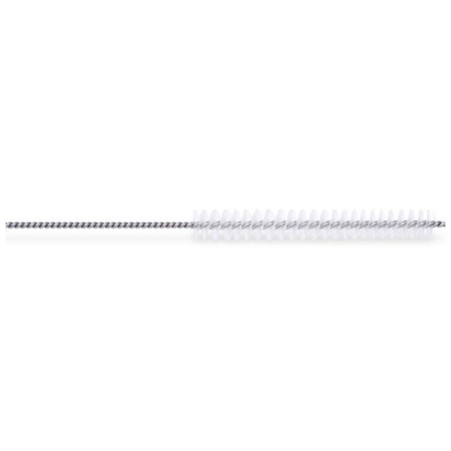 A channel-cleaning brush configured for endoscopic and surgical instrument maintenance integrates a nylon bristle segment with a twisted stainless-steel core to deliver precise, controlled contact within narrow internal channels. The component’s 9.5 Fr dimension and 0.125-inch outer diameter support passage through small lumens while preserving surface integrity of delicate equipment. The 18-inch overall length enables effective reach across extended instrument pathways to ensure complete internal coverage.