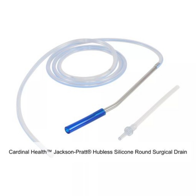 This drain features a two-piece system that accommodates both flat and round designs. The round hubless version includes a radiopaque stripe, enabling accurate x-ray visualization and monitoring of drain placement. Measuring 6 inches in length with a 15 Fr. diameter, it is suitable for a variety of surgical applications requiring controlled wound drainage.