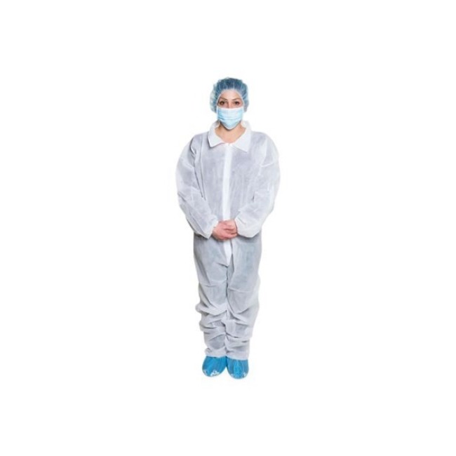 Made of durable spun bonded polypropylene. Front zip closure. Elastic wrist and ankle cuffs.