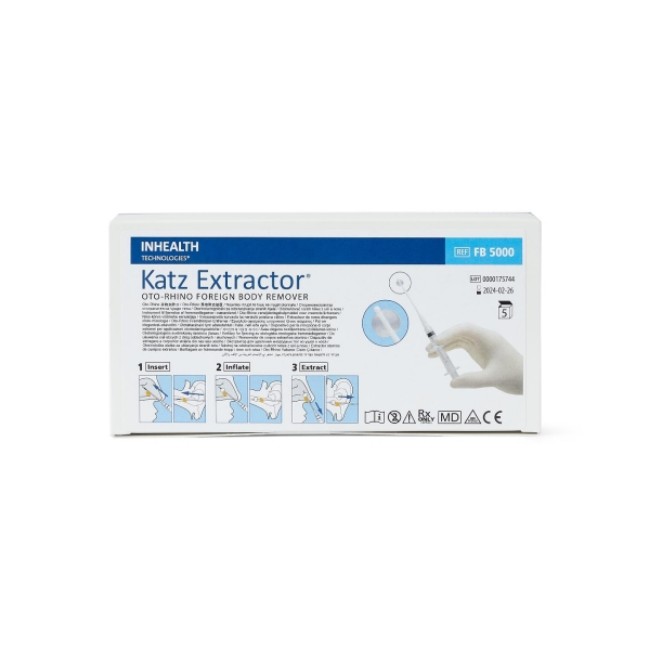 Katz Extractor oto-rhino foreign body remover is a small, lightweight, single use device for quick and easy extraction of foreign bodies from the nose or external ear canal. It comes in a convenient, ready-to-use, five-pack dispenser box. There are no expensive supplies (such as Fogartys, Foleys, syringes, forceps, etc.) to hunt and assemble # and no additional suction equipment is required. We are confident that once you try the Katz Extractor oto-rhino foreign body remover, you will be impressed with its fast, no hassle, easy-to-use qualities that will bring smiles to your patients and staff. Designed in conjunction with David L. Katz, MD, MPH, the Katz Extractor oto-rhino foreign body remover is intended principally for extraction of impacted foreign bodies in the nasal passages. This device may also be used in the external ear canal, based upon clinical judgment. Insert / Inflate / Extract Removal of foreign bodies has never been easier. It only takes three simple steps to complete an extraction with the Katz Extractor oto-rhino foreign body remover.