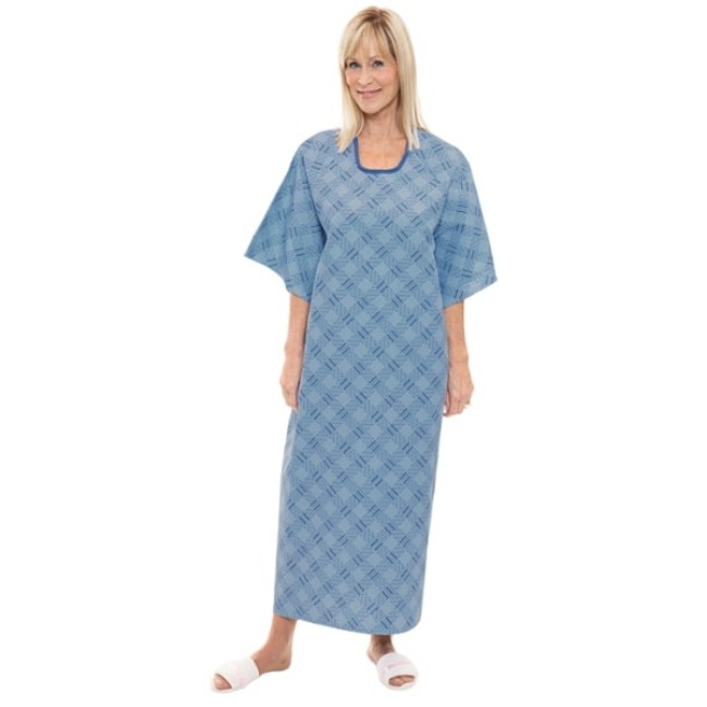 This gown features a 55-inch sweep, providing ample coverage for the lower body and sides. The six-inch sleeves allow for ease of arm movement while maintaining modesty and coverage. It is equipped with strong back ties that ensure a secure and adjustable fit, accommodating various patient sizes.