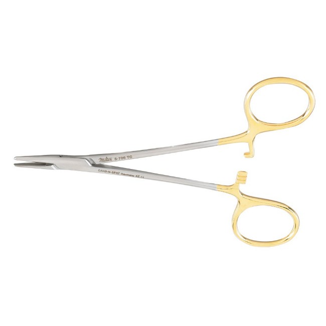 The instrument features smooth jaws with tungsten carbide inserts, offering enhanced grip on surgical needles without causing unnecessary damage. The carbide inserts also extend the working life of the instrument by providing superior wear resistance compared to standard stainless steel jaws. This makes it an efficient choice for repeated use in procedures requiring fine needle handling.