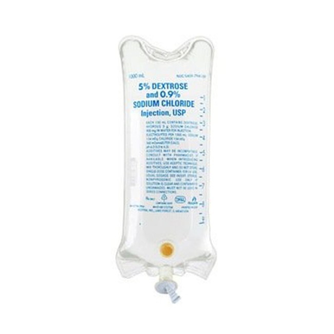This IV solution consists of 5% dextrose, which serves as a carbohydrate source, and 0.9% sodium chloride, which acts as an isotonic fluid to aid in restoring circulating volume. The combination helps prevent hypoglycemia while simultaneously correcting fluid deficits. It is suitable for patients requiring maintenance fluids or those experiencing mild to moderate fluid loss due to illness or surgery.