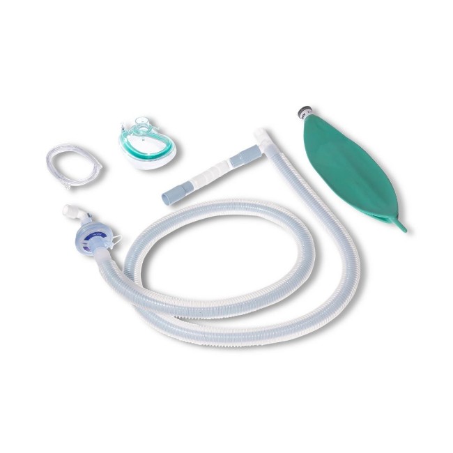 The kit includes a 72-inch coaxial breathing circuit, a filter/HME (Heat and Moisture Exchanger), a size 5 ComfortStar face mask, a 3-liter latex-free breathing bag, and a gas sampling line. The coaxial "tube-in-tube" design allows expiratory gases to warm the inspiratory gases, maintaining patient temperature and comfort while minimizing condensation and heat loss.