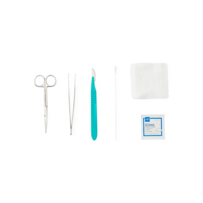 - Kit DYND71200 contains: Iris Scissors Straight, 6 Cotton Tip Applicator, Adson Thumb Forceps, 2 12-Ply Gauze (3 x 3) ,Alcohol Prep Pad, Scalpel (No. 10).