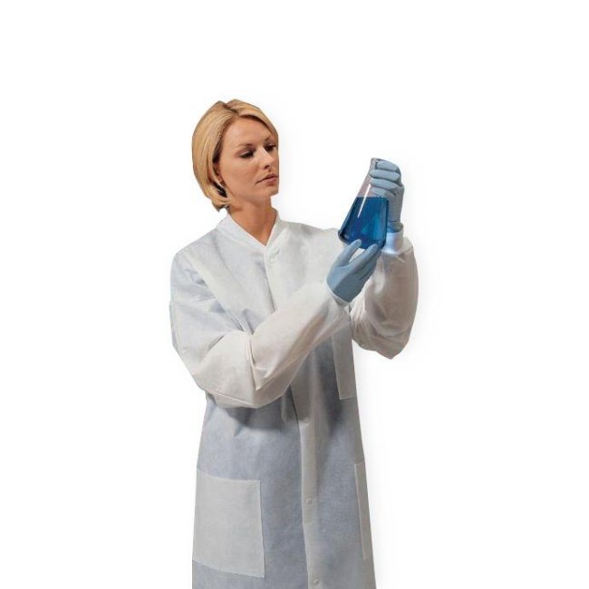The LAB COAT SMS Large Knee High White is a durable protective garment designed for laboratory and clinical environments. Constructed from tri-layer SMS material, the coat offers fluid resistance while maintaining breathability and comfort. The thick, laminated fabric provides reliable protection against splashes and minor chemical exposure, supporting safe handling of liquids and samples.