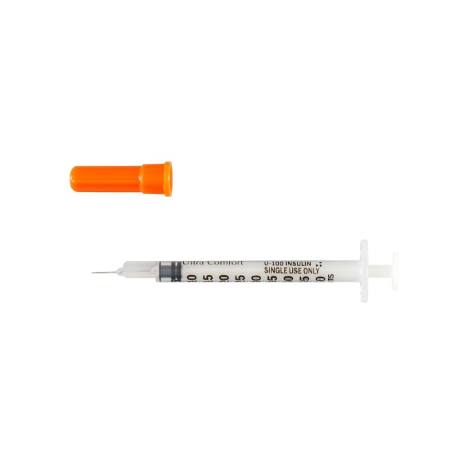 The syringe utilizes a polypropylene barrel and a flat ACCU-TIP plunger, ensuring smooth operation and durability. The attached 30-gauge, 5/16-inch stainless steel needle is designed for single-use administration. Sterile packaging in a soft pack maintains product integrity until use. The fixed needle tip is compatible with U-100 insulin formulations, supporting safe and effective subcutaneous injections.