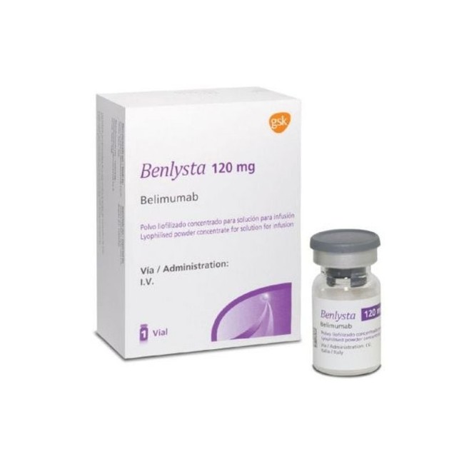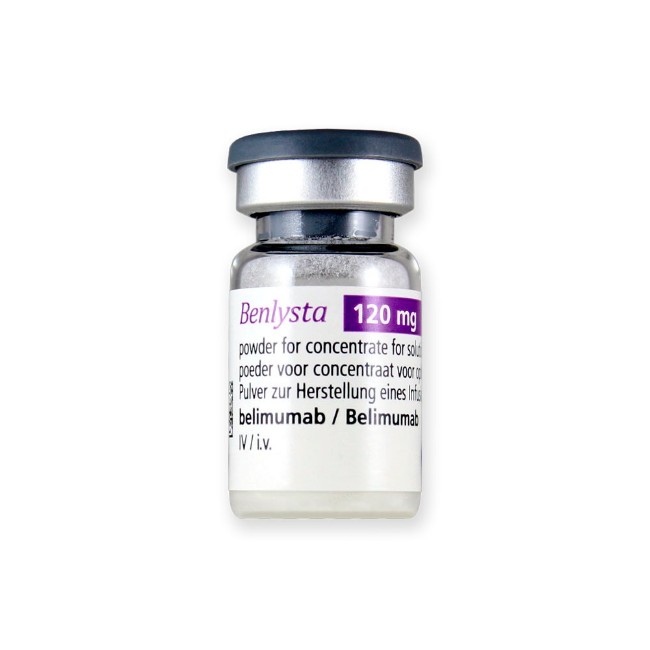 Benlysta is supplied as a sterile, preservative-free, lyophilized powder for intravenous infusion. Each single-dose vial contains 120 mg of belimumab in a 5-mL volume. The formulation requires reconstitution and dilution prior to administration. The product is provided in a glass vial with a rubber stopper (not made with natural rubber latex) and a flip-off seal.