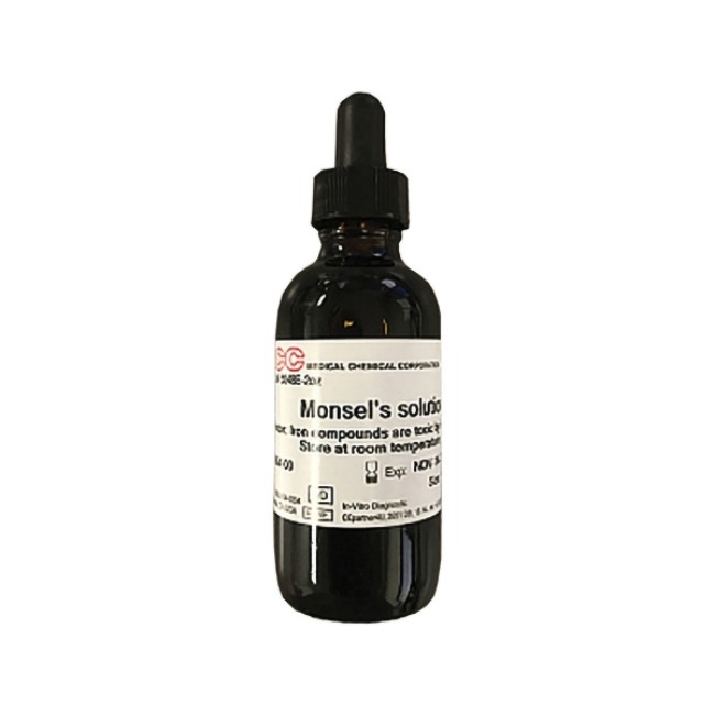Medical Chemical's Solution, Monsels, is a sterile hemostatic agent commonly used in minor surgical procedures to control bleeding. Packaged in a 2-ounce dropper bottle, this solution contains concentrated ferric subsulfate, which effectively promotes hemostasis.