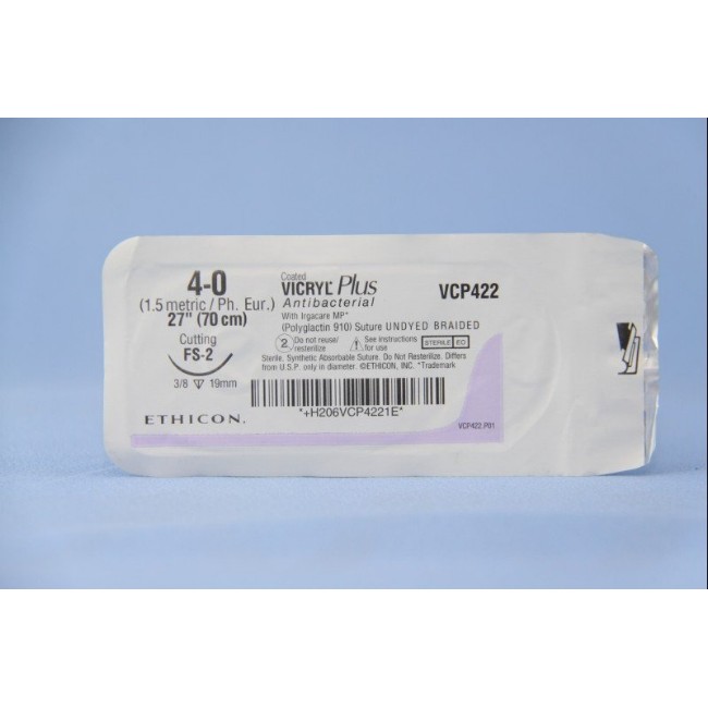 Sutures, Vicryl: Coated Vicryl Plus Antibacterial (Polyglactin 910) Suture, Undyed Braided, Size 4-0, 27" L, Needle Name FS-2 is manufactured by ETHICON™.