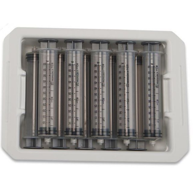 Each syringe is nested within a polystyrene tray with a Tyvek® lid, providing tamper-evident packaging for enhanced safety and sterility. The convenience tray contains multiple syringes, allowing efficient workflow and minimizing handling time in pharmacy or hospital environments. Syringes are pre-sterilized and ready for immediate use, reducing the risk of contamination.