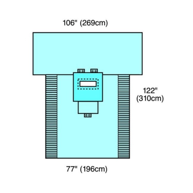 The Transverse Laparotomy Surgical Drape 77in x 122in Armboard Width 106in Rectangular Fenestration 14in x 4in Adhesive Reinforced 30.5in x 30in is a sterile drape designed for abdominal and laparotomy procedures. It provides full coverage of the surgical field while maintaining a controlled sterile environment, reducing the risk of contamination and supporting aseptic technique.