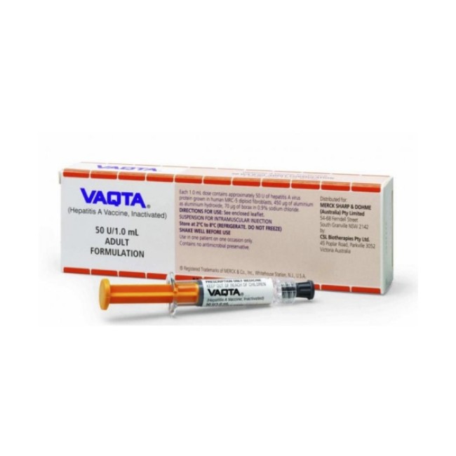 VAQTA is a hepatitis A vaccine that is supplied in a prefilled syringe containing 50 units per ml. The vaccine is prescribed to adults (people older than 18 years of age) to prevent them from hepatitis A, a liver disease caused by Hepatitis A Virus (HAV). The vaccine works by triggering the production of antibodies and takes 2 to 4 weeks as an onset to immunize a person against the Hepatitis A virus fully.